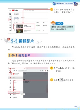 5 我是小小 Youtuber 15 這時,影片就會在自己 的影片一覽表裡面了。 小提示 வࣛఱ̙˸ሗፋλʾԸᓭᚎ ᅂ˪dᄣ̋ᓃቡଟəf 5-5 ᇜ፨ᅂ˪ YouTube 提供了許多功能,讓我們可以線上編輯影片,來看看怎麼做 吧! 5-5-1 ᅂ˪ 對影片最常用的裁剪方式,就是去掉頭、尾多餘的部份。這裡我們打算 把「貓咪玩球」影片由 1 分 24 秒剪短到 1 分鐘以內。 1 在 YouTube 首 頁, 點 一下 。 2 點選【 你的影片】。 097