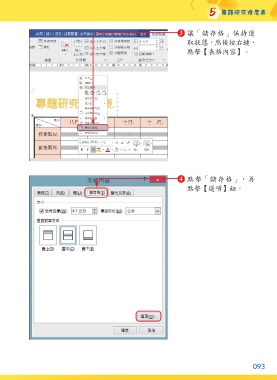 5 專題研究進度表 3 讓「儲存格」保持選 取狀態,然後按右鍵, 點擊【表格內容】。 4 點擊「儲存格」,再 點擊【選項】鈕。 093